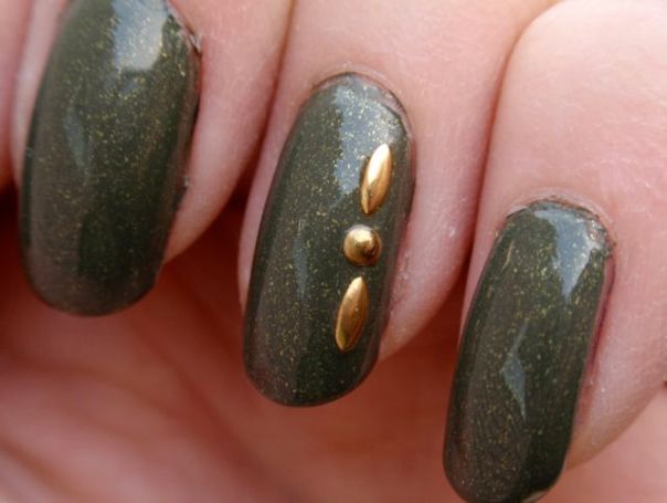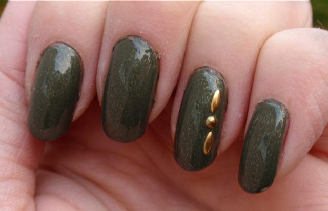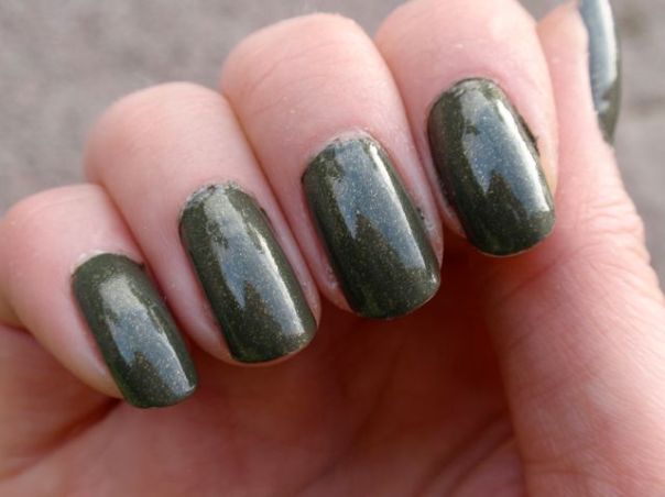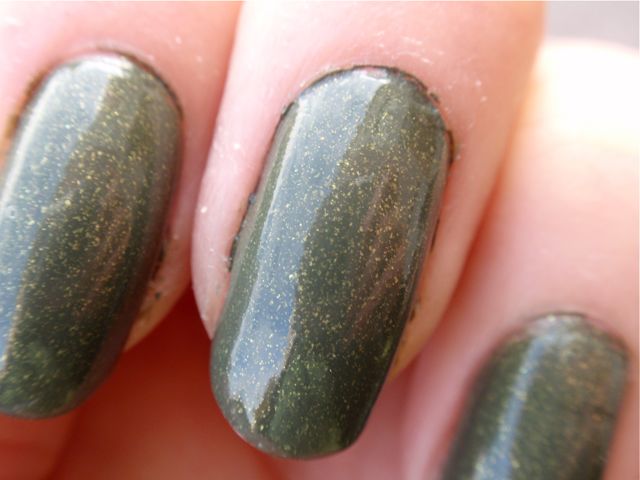 Jag var sugen på något lite lugnare lack, och då föll blicken på det här. Yara är verkligen ett otroligt fint lack. Basfärgen är en lugn, ganska mörk olivgrön och så har den en hel del smått guldglitter i sig. Om man tittar riktigt nära kan man också se skimmer i ljusare grönt, och kanske lite rödorange (men det kan vara inbillning). Jag var beredd på att det kunde vara ett lack där skimret syns jättebra i flaskan men inte alls på nageln, men där hade jag fel. Det är lika skimrigt i verkligheten.