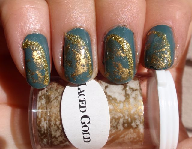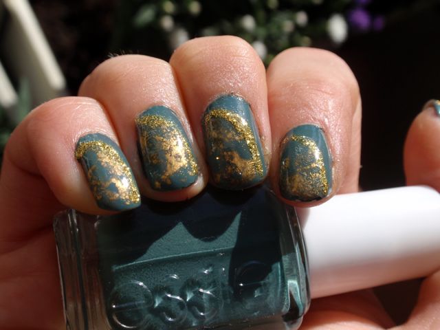 Jag insåg när jag lackade med det här att det var länge sedan jag använde nagelfolie, så jag dekorerade med lite sån. Det blev väl sådär. Satte en guldspräcklig, delvis transparent folie (vid namn Laced Gold, köpt från No1 Nail Art Shop på eBay) på delar av nageln. Förstärkte kanten med ett guldglittrigt nail art lack som blivit rätt klumpigt med åldern och därmed blev rätt ojämnt. Folien var snäll att hålla på med, men det här var inte den snyggaste foliemanikyren jag har gjort. Den var visserligen bättre IRL än den blev på kort, men ändå.