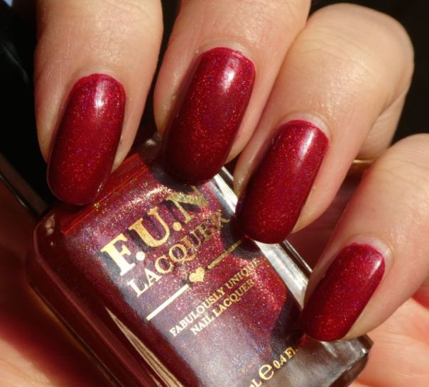 Nu när våren faktiskt är här (i alla fall till och från, mellan snöbyarna) så har Sminkan och Emma skakat liv i holofredagen igen! Kul, för nu börjar jag bli holosugen igen! I förra veckan var jag i Prag med min mamma och bror för att fira mammas födelsedag, och då bar både jag och mamma F.U.N Lacquer Powerful, ett av lacken från deras samarbete med Sveta Sanders. Jag älskar den röda färgen, som är riktigt fin och djup, men holot kunde tyvärr ha varit starkare. Nog finns det regnbågar där, men det är inte som att de slår en i ansiktet, direkt… Applikationen var bra i alla fall, och två lager räckte för att få det täckande. Klistermärket på ringfingret är från Kiss och är inköpt i San Francisco.