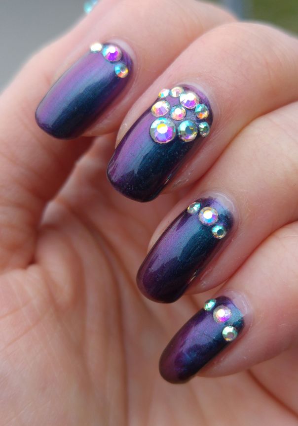 In English: Another gorgeous multichrome from F.U.N Lacquer! Eternal Love shifts mainly between blue and purple, but there is also some green in it at some angles. I wore three coats and the application was excellent. I have bought the rhinestones from Edgy Polish, and while they are very nice, I think I went slightly overboard with the bling. Less would probably have been more in this case. 😛