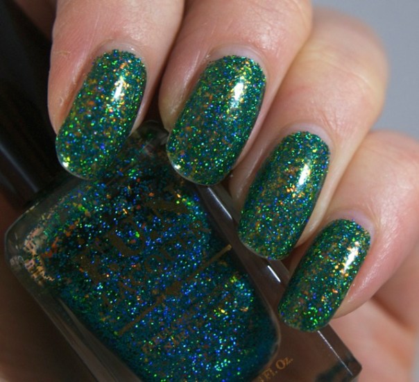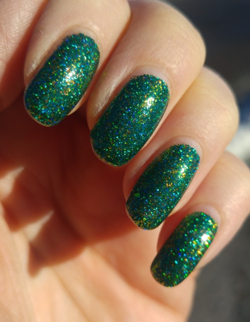 This polish reminds me of why indies generally are more fun than main stream polishes. It is just really beautiful. The base is duochromatic and shifts between green and a brownish purple, and to top it off it also has a pretty holographic shimmer. Of course, there was no sun when I wore it, so you’ll have to use your imagination to see how beautiful it must be in the sun.