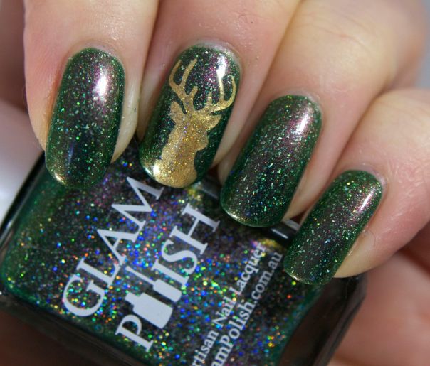 Dekoren är nagellacksdekaler som jag gjorde med vinylmallar från What’s Up Nails och CND Ballroom Baubles, toppat med Gold Diamond Dust Holo Top Coat från F.U.N Lacquer för lite holobling även på hjortarna. Lite pilligt var det allt att få upp dekalerna från silikonmattan, men jag tycker det blev riktigt fint! Och om jag hade använd vinylerna direkt på naglarna hade det garanterat blivit kladdigare…