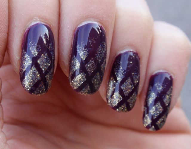 The base is two coats of OPI Skating on Thin Ice-Land from the 2014 Nordic collection (a press sample) It is a nice reddish purple creme with a good formula. After that I covered the skin around the nail with Liquid Palisade and created a grid with nail vinyls that I sponged on F.U.N Lacquer Honey Bear over on the tips.