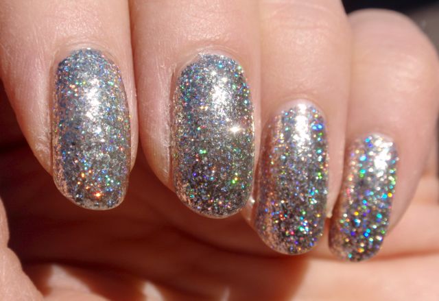 24 Karat Diamond (H) är ett sånt där lack som har stått alldeles för länge bland mina otestade. Det hamnade längst bak och blev bortglömt tills nu. Och det är synd, för det är ett jättefint prismatiskt silverhologlitter. Jag bar tre lager, fast det hade kanske räckt med två egentligen, och det var trevligt att applicera.