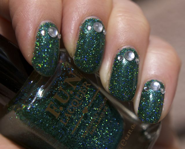Jag börjar få tillbaka blogglusten lite nu när det börjar se ut som att mina naglar har hämtat sig (även om jag fortfarande inte lackar dem – det här är ett arkivinlägg), så den här veckan tänkte jag t o m vara med på Grön onsdag för första gången på jättelänge! Och så mycket grönare än så här blir det inte! F.U.N Lacquer Secret är ett underbart, superglittrigt skogsgrönt prismatiskt underverk som får mitt hjärta att slå lite fortare. Så vackert! Det är inte jättetätt, dock, så jag behövde fyra lager för att det skulle täcka helt och det var lite knepigt att få det helt jämnt. Men det var det banne mig värt!