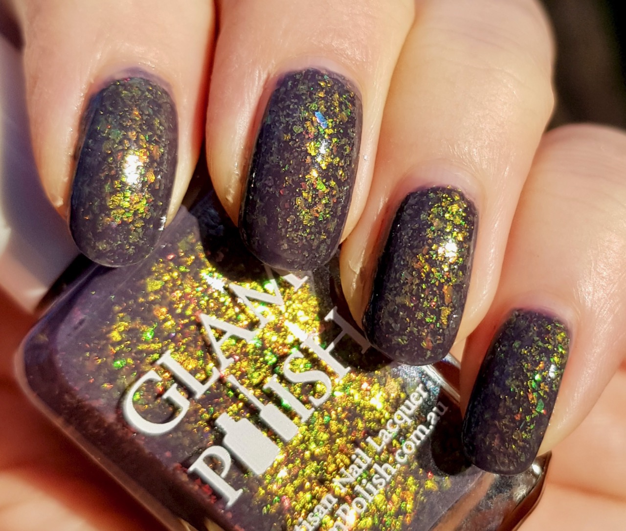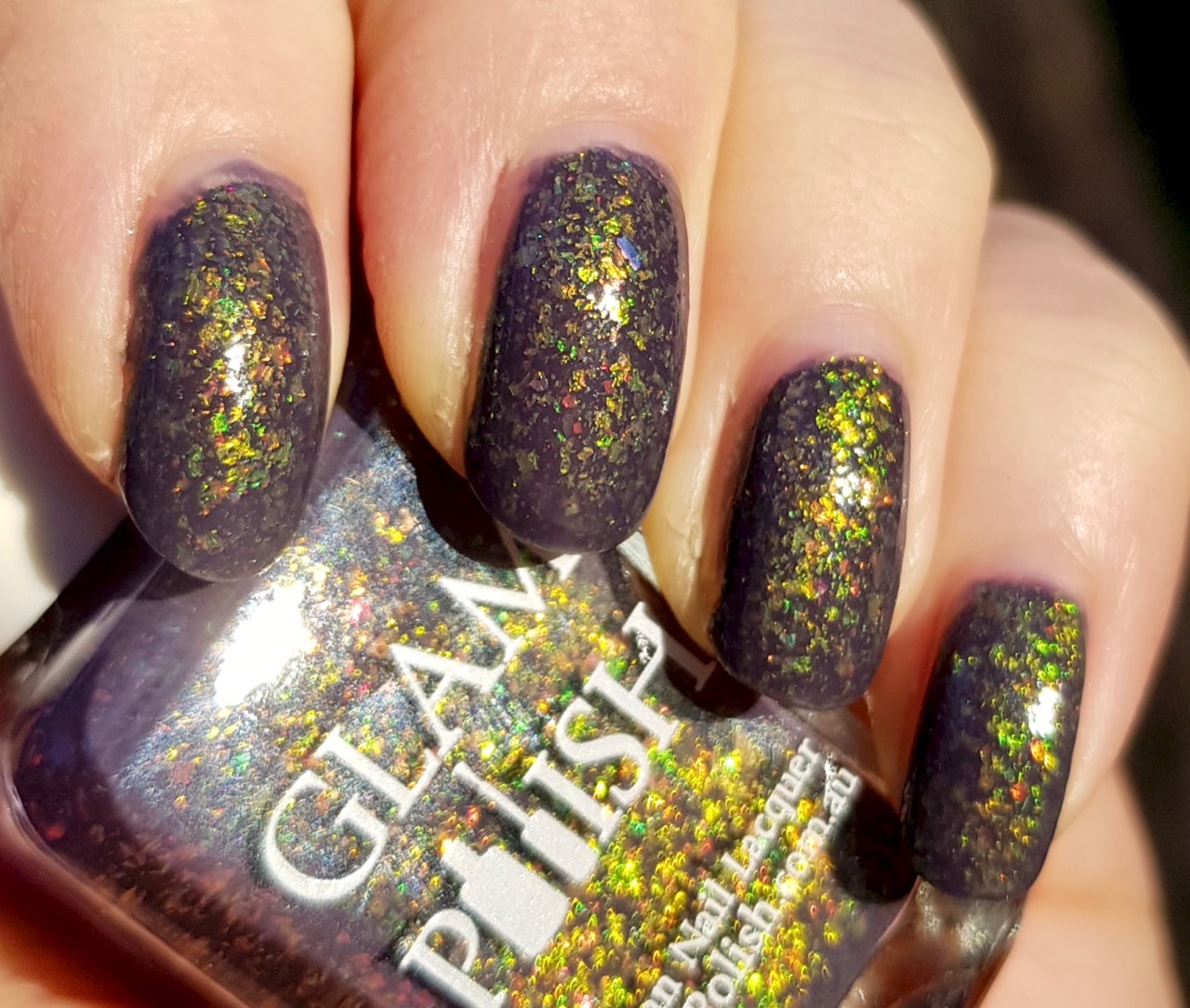 Interview with a Vampire från Glam Polish är ett lite mystiskt lack. Basfärgen är inte duokrom, men den ser väldigt olika ut i olika ljus. Det är någon slags grålila som ibland ser nästan grönt ut och ibland är mer kallt lila. Det är dessutom fullt med multikromatiska iridicerande flakies, så det händer mycket i det.