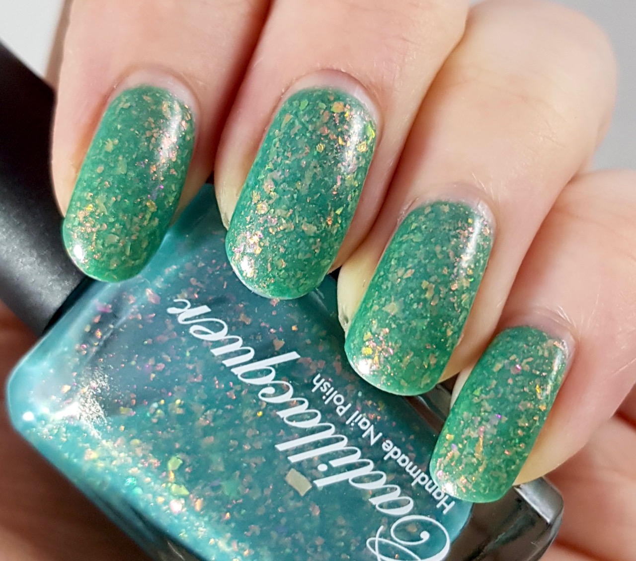 En del termolack är mer termo än andra. Det här är inte ett av dem, utan det här är ett sånt där som man måste titta ganska noga på för att se skillnaden. Enligt beskrivningen ska det vara gräsgrönt när det är kallt och ljusblått när det är varmt, men min flaska blev bara lite mer grönblå när den var kall. Det kan vara så att den har fått stå lite för länge och tappat effekten. Det är snyggt i vilket fall, även om det hade varit kul med en tydligare termoeffekt. Det har iridicerande flakies i rosa/guld/orange samt rött/orange/grönt och ser squishigt och härligt ut! Ganska skirt, men täckte på tre lager. Det var aningens tjockt att lacka med, men inte så det störde.