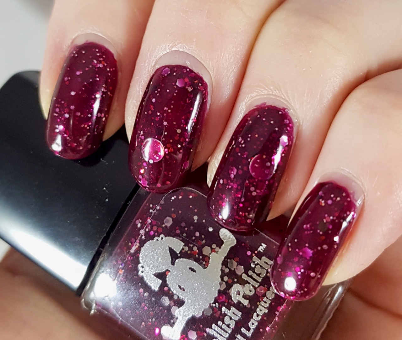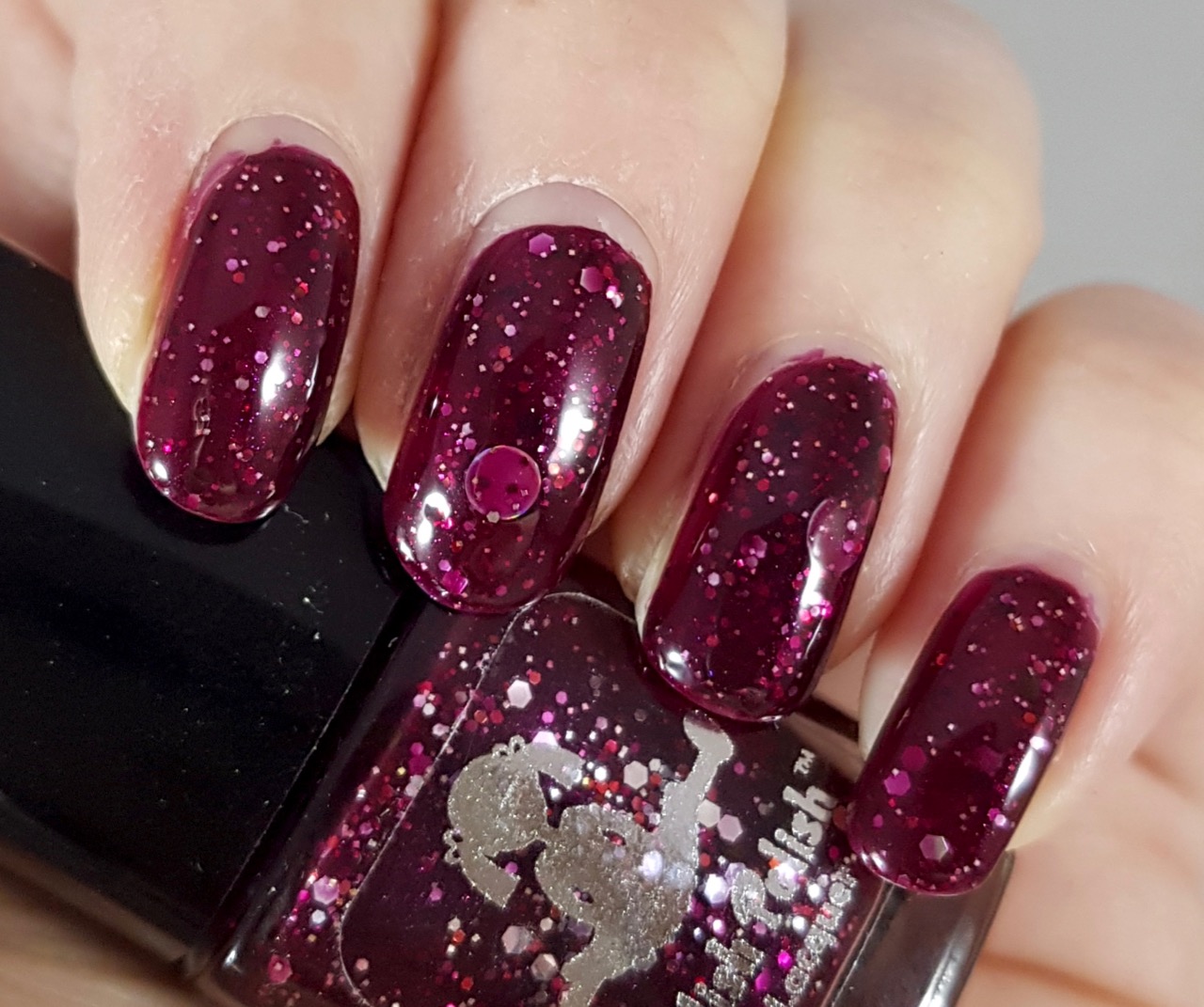 Jag brukar vara rätt duktig på att skriva några noteringar om lack när jag bär dem, men i våras var jag så osugen på att blogga att jag inte ens kom fram till det. Sålunda har jag inga noteringar om det här lacket och vet varken hur många lager jag hade eller hur det var att måla med. Det är köpt från Hypnotic Polish i alla fall, och är ett lila glitterlack med både hologlitter och reflexglitter. Mycket glittrigt och fint!