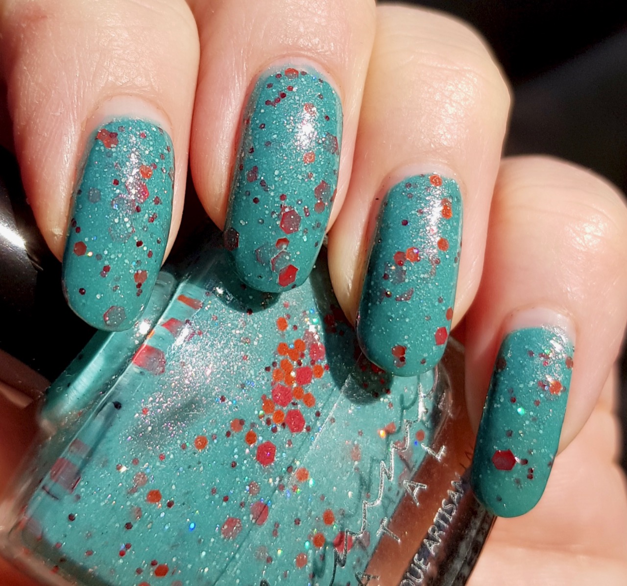 In English: Interstellar Bursts from Femme Fatale is a fun polish in a quite unique colour combination. The base is teal and it has a generous sprinkle of prismatic miniflakes and different sized red glitters. I liked it a lot!