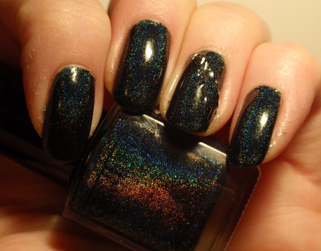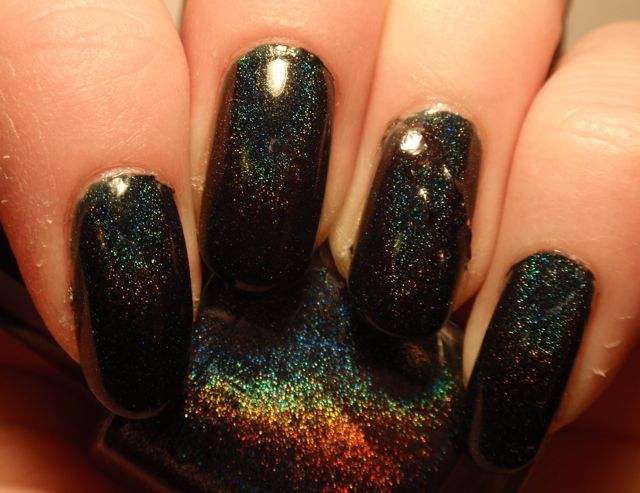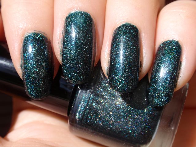 Det här lacket har blivit väldigt hypat, och jag hade höga förhoppningar, men jag är faktiskt inte särskilt impad. Det är väldigt mörkt grönt, nästan svart, och i normalt ljus syns inte holot särskilt mycket. På mina första bilder ser det rätt sjysst ut, men de är tagna under min skrivbordslampa som verkligen lyfter fram holo. Den sista bilden visar hur det ser ut normalt sett. Det är fint, men inte spektakulärt. Det finns en antydan till holo, men den syns bara på nära håll. Nu ska väl sägas till det här lackets försvar att det inte fanns minsta tillstymmelse till sol när jag bar det, så det var inte direkt optimala förhållanden. Jag ska nog ge det en chans till i sommar. Det ser ju så himla fint ut i flaskan…