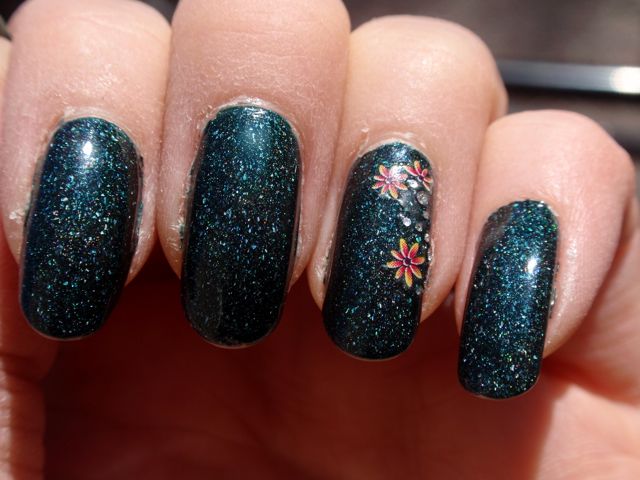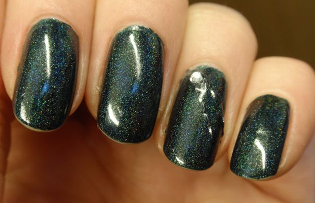 Another wonderful Nerdlacquer! This one is unfortunately not mine, it belongs to a friend who adopted it when I realised that I couldn’t really buy all of the nerds I managed to throw into my cart at the release. But I got to borrow it and can therefore show it to you! It has a dark olive base, lighter green glitters and blue shimmer. I think two coats was enough for opacity and the formula was fine.