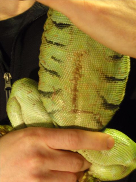 Till slut en jämförelse med en riktig ödlemage. Inte alls samma färg, i det här fallet, men det finns ju många sorters ödlor. Katlas mage är mer i färg med OPI Who the Shrek are you? eller kanske Chanel Peridot. Fint randig är den också. Tyvärr har hon också ett stort ärr på sin stackars mage efter de två steriliseringar hon har varit tvungen att genomgå. Det är tyvärr rätt vanligt att leguaner i fångenskap får problem med att lägga ägg eftersom de inte hittar något bra ställe att lägga dem på. Vi försökte bygga en äggläggningslåda åt henne, men den dissade hon direkt. Så när hon hade gått med ägg i magen jättelänge och blivit magrare och magrare (hon slutade att äta eftersom det inte fanns plats för annat än ägg i magen) så blev vi tvungna att operera henne. Det är inte helt ovanligt att leguaner dör av att äggen ruttnar i buken på dem. De kan också resorbera dem, men det vågar man inte räkna med när det har gått lång tid med ägg i magen. Stackarn, hon hade väl närmare en halvliter ägg i magen och var jättetunn när de väl kom ut. Ni kan se på den här bilden som finns på klinikens hemsida hur eländigt tunn hon var. De tog bort hennes äggstockar samtidigt, och vi hoppades på att det skulle vara slutet på trasslet, men icke. Hon verkar trivas så bra hos oss att hon absolut ville ha ägg och återbildade en av sina äggstockar under året som gick. Enligt vår veterinär är det väldigt ovanligt att det händer, och det tyder på att hon mår bra i övrigt, så det är ju bra att veta att hon trivs hos oss. Men det blev i alla fall ytterligare en operation av stackars Katla ett år senare och den här gången tog det. Nu har det inte varit några problem med ägg på några år i alla fall, tack och lov, så nu är nog faran över. Hon verkar i alla fall må prima och är om något lite tjock om magen av att äta för mycket mandariner. Numera står hon på diet och får bara mandariner varannan dag. Det tycker hon inte riktigt är ok, hon brukar komma fram och ”fråga” efter bättre mat när det inte ligger några mandariner i hennes matskål. 🙂