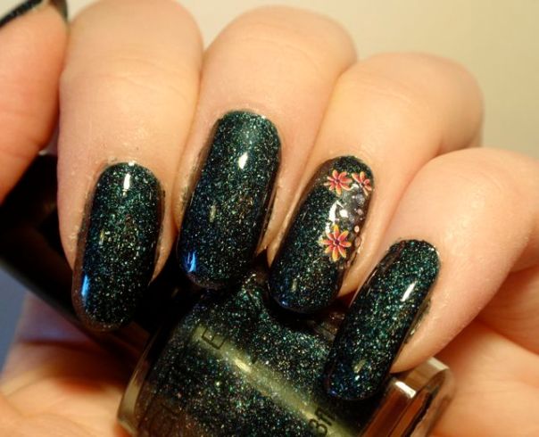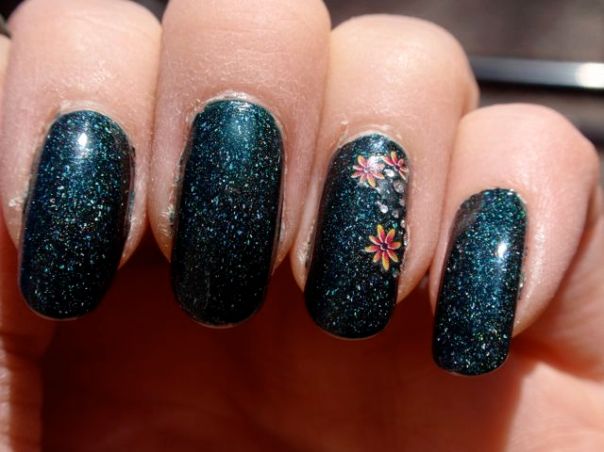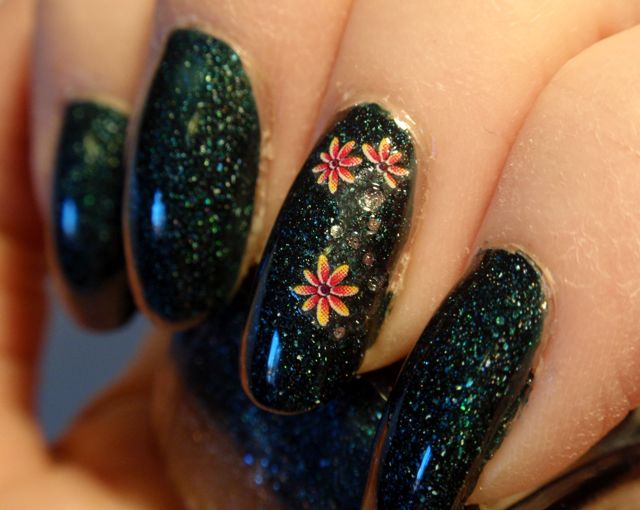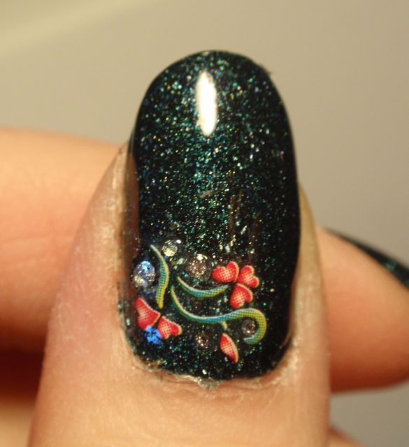 Dekoren blev jag inte särskilt nöjd med. Det är ”laser strands” från No1 Nail Art Shop på eBay av samma sort som jag hade här, fast i svart och silver, och en strassten. Tyvärr syntes det inte särskilt väl eftersom lacket var så mörkt.
