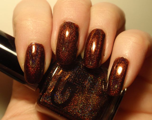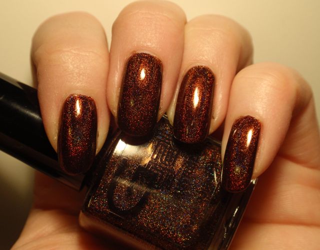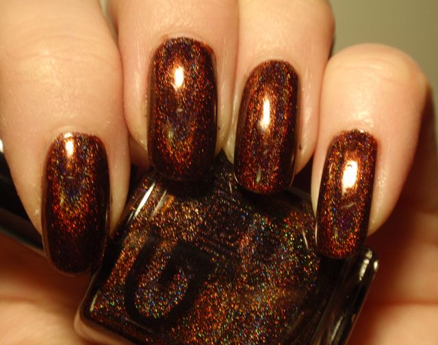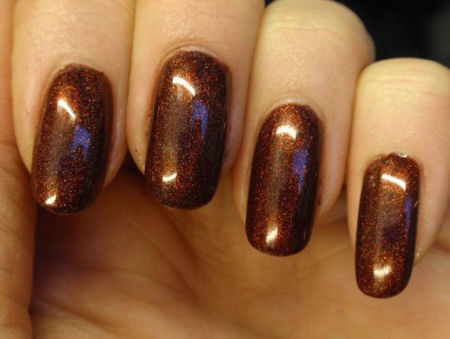 I’m not normally the world’s biggest holo fanatic, but I really like this one! Most holo polishes are too light for my taste, and since the beautiful rainbows generally hide in the indoor lighting where I spend most of the day, I get a little disappointed by how they look most of the time even though they are beautiful once the sun hits them. This reddish brown is a colour I really like even when it s not showing any rainbows. The holo effect is quite good in this one, though, and are even slightly visible indoors.