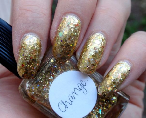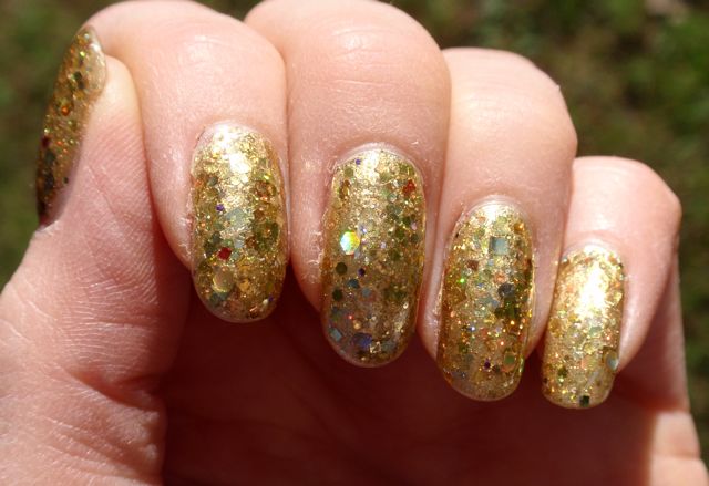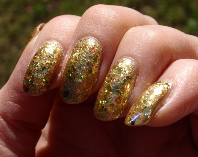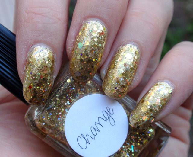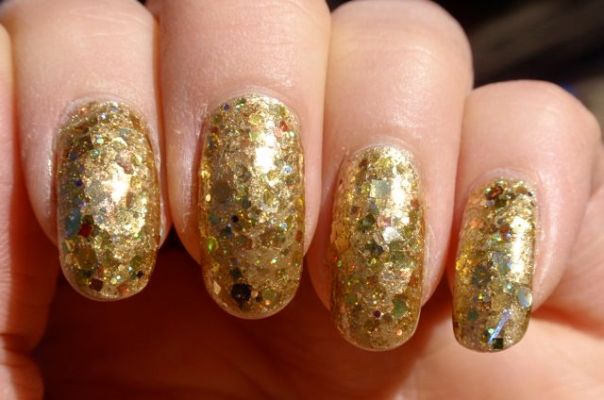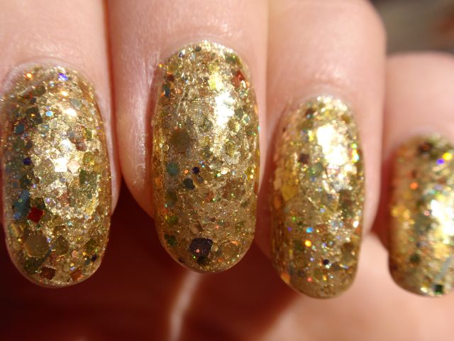 Lynnderella Change är inte direkt diskret. Inte någonstans faktiskt. Det är ett sånt där lack som får kassörskan på Konsum att fråga om jag har 24 karat på naglarna. Det blir inte så mycket blingigare än det här. Behöver jag säga att jag älskar det? 🙂 Det är dels guldglitter, men också prismatiska glitter och spridda glitter i andra färger. Alltihopa i olika former och storlekar, som det brukar vara i Lynnderellas lack. Det är inte så täckande däremot, jag hade två lager och det hade behövt minst två till för att få det att täcka på egen hand, tror jag. Nu grundade jag med två lager Gosh Gold, så det var inget problem för min del.
