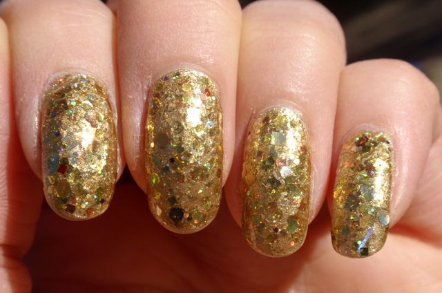 Här är ännu ett lack som jag köpte i Glasgow i höstas. GOSH är väl lite knepigt att få tag i i Sverige, jag har aldrig sett det i någon butik i alla fall. Synd, för det här var ett riktigt trevligt lack. Det står ”Special edition” på det, däremot, så det är väl risk för att det inte ingår i standardsortimentet. När jag såg det i flaskan såg det mest ut att vara ett vanligt guldbrunt skimmerlack, men när jag fick det på naglarna visade det sig innehålla smått mångfärgat eller kanske prismatiskt skimmer som gör det lite roligare. Dessutom skiftar det lite åt grönt i vissa ljus. Jag gillar det verkligen! Lacket var ganska tunt, men hanterbart. Jag hade tre lager av det.