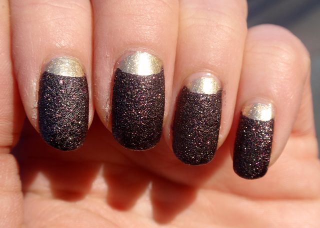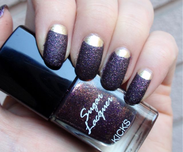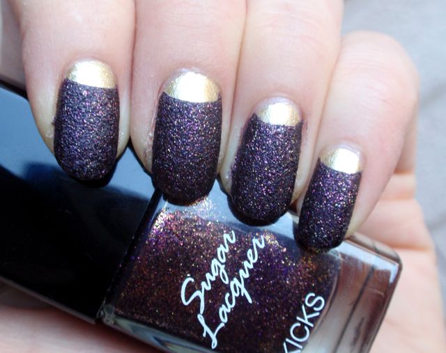 Den här manikyren blev jag riktigt nöjd med, i all sin enkelhet, och jag har fått en del kommentarer om den (t o m chefen tyckte jag hade häftiga naglar). Som bas har jag två lager GOSH Gold. När det hade torkat maskerade jag av halvmånarna med hålförstärkare och målade ett flödigt lager av Kicks Black Diamond från deras Sugarlacquerkollektion. Black Diamond är mörklila i basen och jag tror att det har multifärgat skimmer, även om man mest ser det gnistra i rosa och blått. Det var lätthanterligt att lacka med och torkade rätt fort. Jag gillade kombinationen mellan det blanka och det mattglittriga, jag tycker det funkade bra.