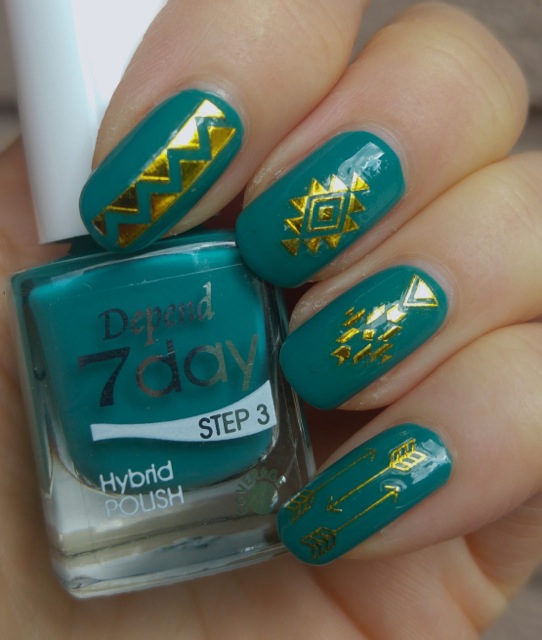 Today’s green polish is Be Courageous, number 7133 from the Depend Celebrate Personality collection. (It was sent to me as a press sample.) It is from the gel hybrid series 7 days, and while I usually think the polishes in this series last well, this got tip wear after just a few days. Anyways, it is a very nice forest green creme. It was opaque in two coats and was easy to apply.