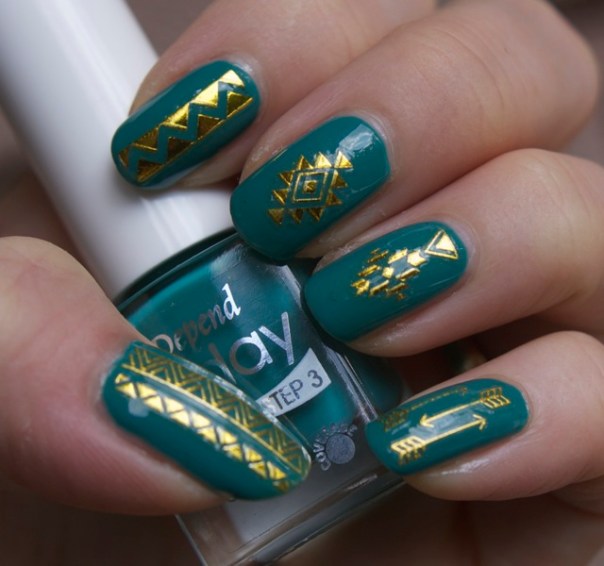 In English: More stamping! I am finally getting the hang of the basics and just need more practice, so my latest manicure also included stamping, albeit of a more discreet variety than my last mani. I used two green Depend polishes that was sent to me as press samples; the olive 538 from the Club Style collection and the dark green 530 from the Dark Beauty collection. Both were nice to apply and took two coats for full opacity.