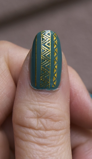 Jag stämplade sedan med 538 över naglarna jag hade målat med 530. Lacket var inte riktigt tillräckligt färgstarkt för att det skulle synas så mycket, men det var snyggt på nära håll i alla fall. Motivet är från VL 020-plattan från Vivid Lacquer. Det är en riktigt fin platta, som jag dock inte har kommit fram till att använda nu, trots att jag köpte den för flera år sedan. Jag har ingen aning om varifrån jag köpte den, men den finns i alla fall att köpa från Harlow & Co om ni skulle vilja ha en själva.