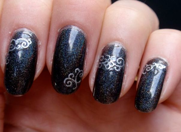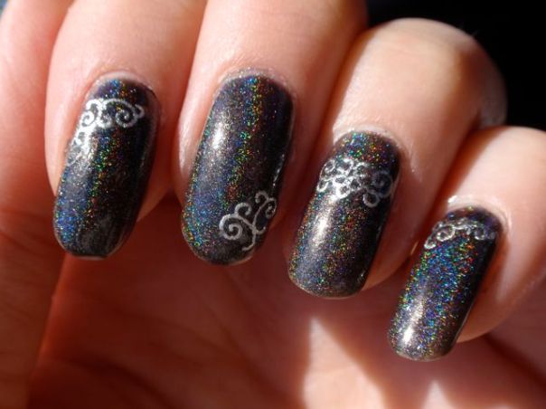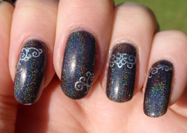 Applikationen på de holografiska lacken är i alla fall bättre än de multikromatiska lacken. Det var inte hopplöst kladdigt, utan helt ok. Jag tror jag hade tre lager. Jag lackade med det här på ett hotellrum utan något annat bord än nattduksbordet, så att kalla det obekväm arbetsställning är ingen underdrift. Dessutom var det rätt dåligt ljus, så applikationen blev väl lite sisådär. Jag har en känsla av att två lager hade kunnat räcka om jag hade kunnat ha lite bättre koll på vad jag gjorde när jag lackade.