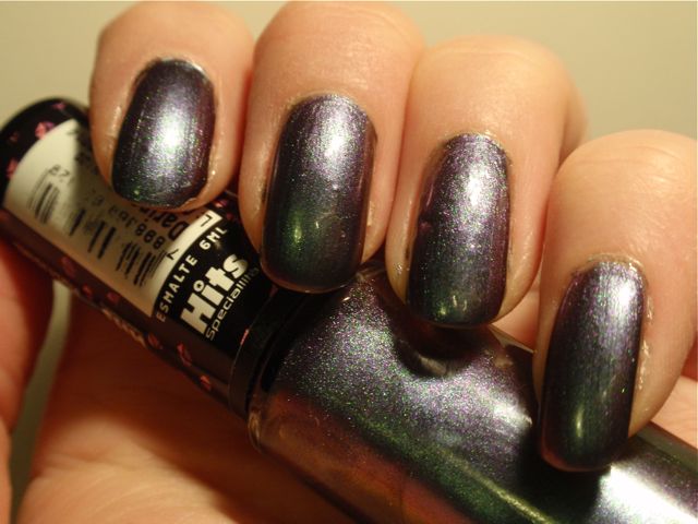 Hits Hefesto är ett holografiskt överlack, det är alltså tänkt att läggas över andra lack för att göra dem holografiska. Jag hade det över det gröna krämlacket Rescue Beauty Lounge Recycle eftersom jag länge har längtat efter ett riktigt djupgrönt hololack. Tyvärr blev det inte så bra. Holot i Hefesto skapas av spectraflairpulver (skulle jag tro) och eftersom pulvret i sig är gråaktigt tog det liksom kål på den gröna bottenfärgen och gjorde hela manikyren lite trist grådassig. Jag tror Hefesto är snyggare över ljusare lack, faktiskt. Jag funderar faktiskt på att använda det för att försöka mig på att franka fram ett grönt holo. Jag funderar på om det kanske skulle funka att blanda Recycle, Hefesto och en hygglig mängd ofärgat lack så det inte blir så att holot drunknar i basfärgen. Vad tror ni som har mer erfarenhet av att franka ihop lack? Jag har ju faktiskt inte provat tidigare.