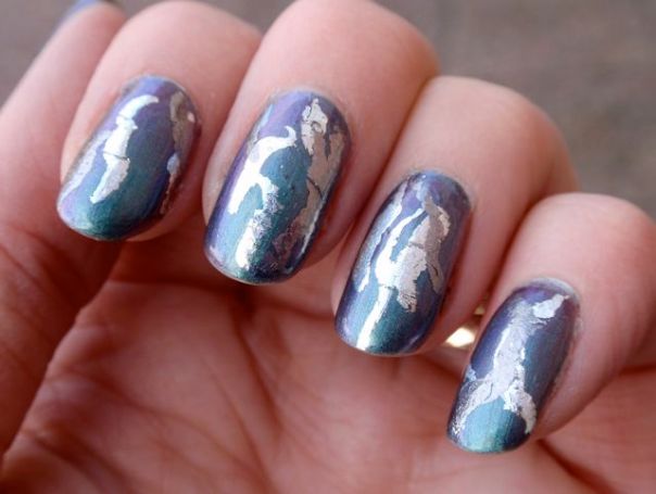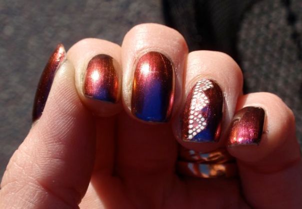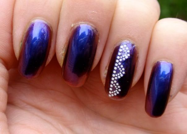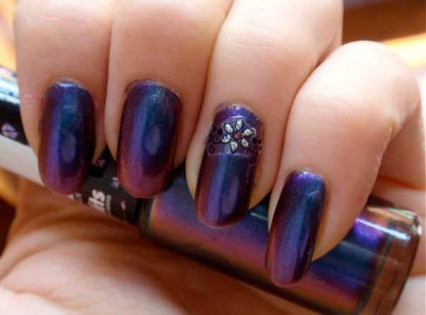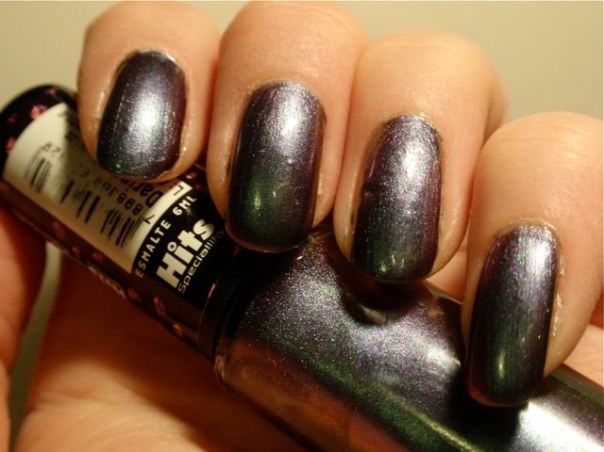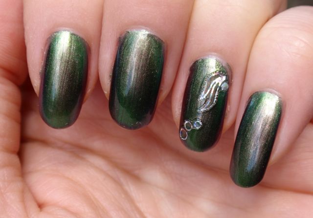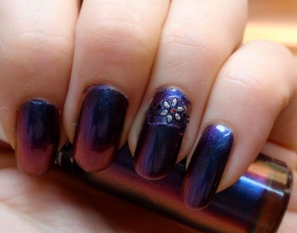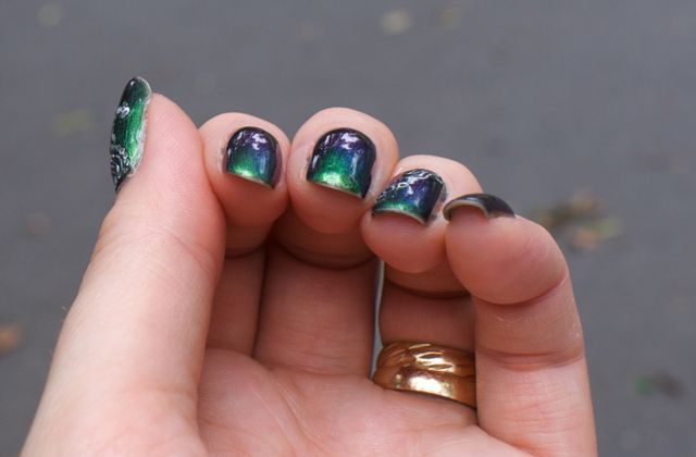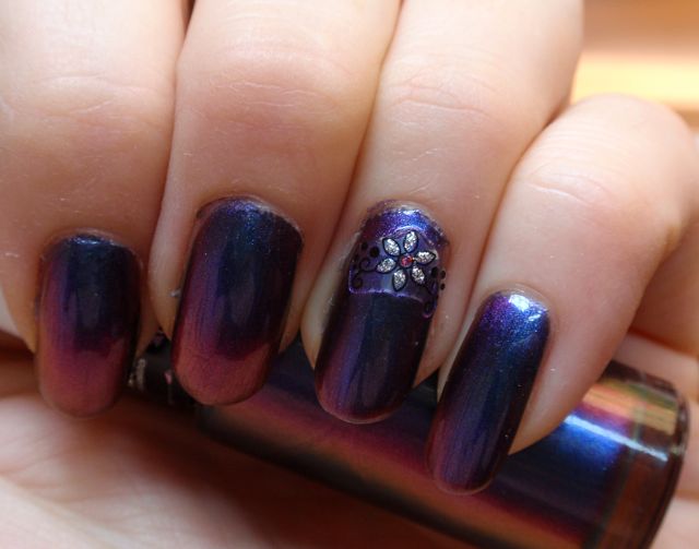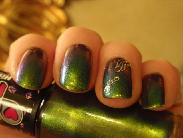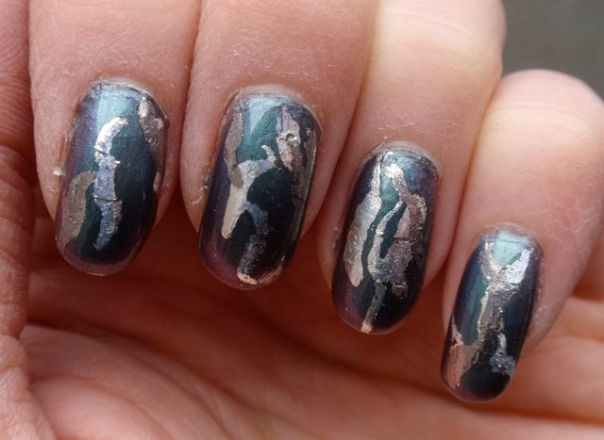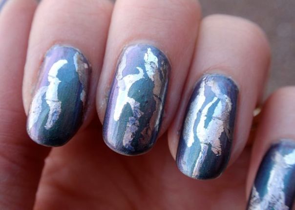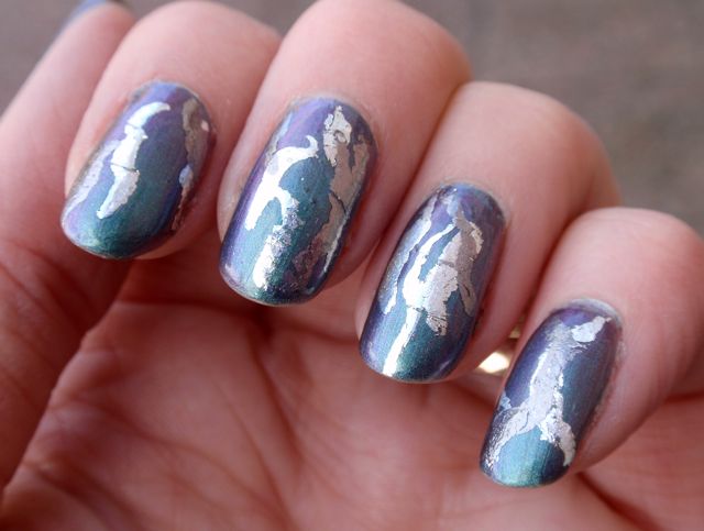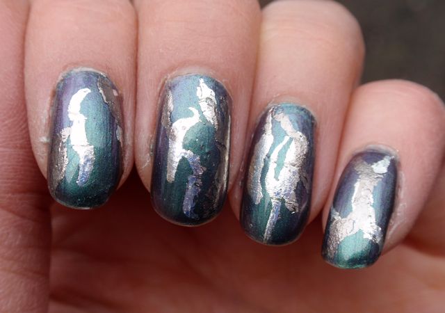 Det har inte blivit så mycket dekorerande på sistone, jag har inte riktigt haft tid, men här hann jag i alla fall slänga på lite nagelfolie. Lacket i botten är Hits Mari Moon Daring, ett multikromatiskt och mycket tjusigt lack. Det är grågrönblått i botten och skiftar tydligt i lilarosa. Väldigt snyggt, men egentligen inte riktigt min favoritfärg. Det var riktigt jobbigt att applicera. De här multikromatiska Hitslacken är kletiga och tjocka och hopplösa att hantera. Dessutom är borsten ganska hemsk – väldigt bred och med en del spretiga strån. Det täckte på tre lager och är så snyggt när det väl är på plats att jag kan stå ut med den hemska applikationen.