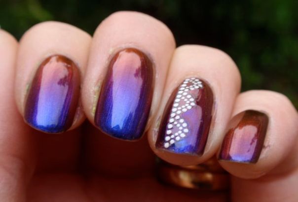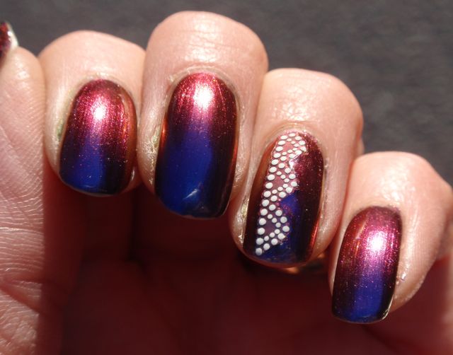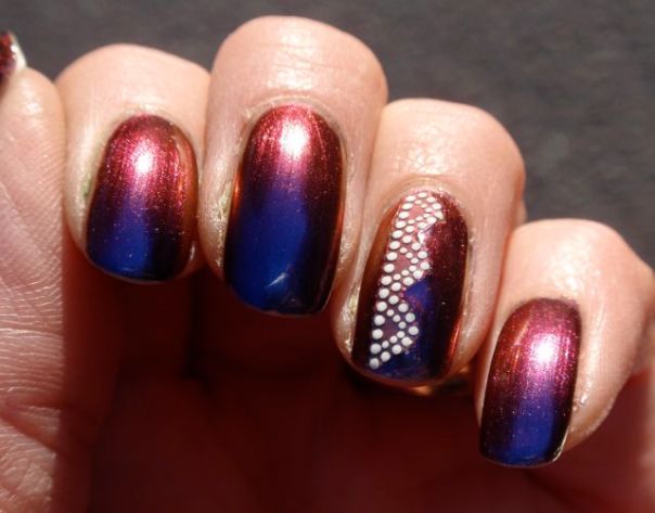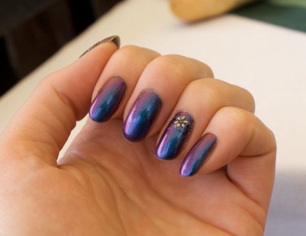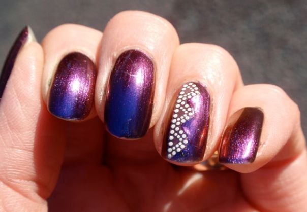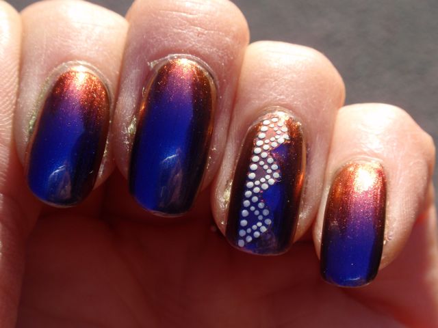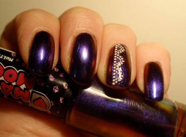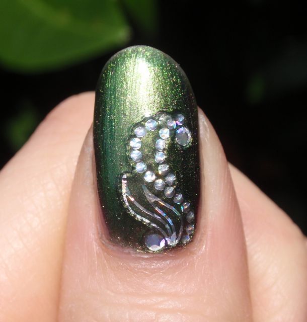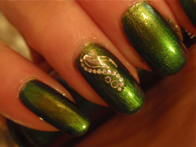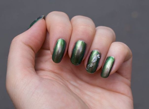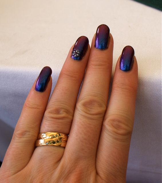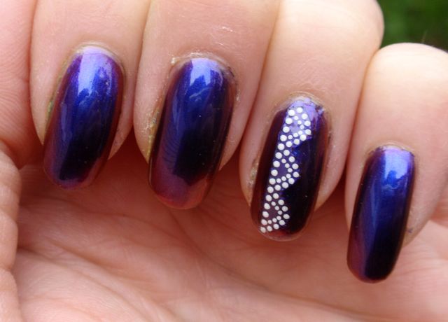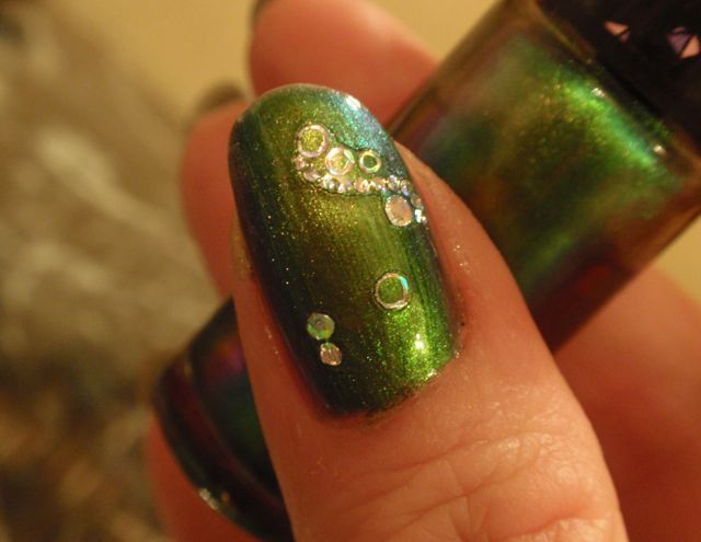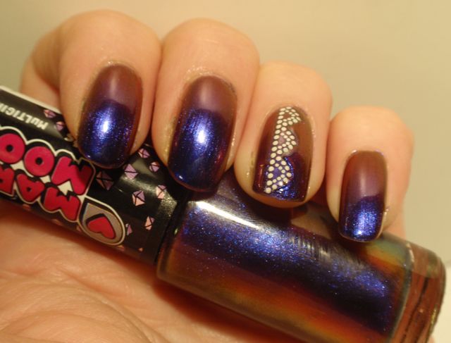 Det har inte blivit så mycket dekorerande på sistone, jag har inte riktigt haft tid, men här hann jag i alla fall slänga på lite nagelfolie. Lacket i botten är Hits Mari Moon Daring, ett multikromatiskt och mycket tjusigt lack. Det är grågrönblått i botten och skiftar tydligt i lilarosa. Väldigt snyggt, men egentligen inte riktigt min favoritfärg. Det var riktigt jobbigt att applicera. De här multikromatiska Hitslacken är kletiga och tjocka och hopplösa att hantera. Dessutom är borsten ganska hemsk – väldigt bred och med en del spretiga strån. Det täckte på tre lager och är så snyggt när det väl är på plats att jag kan stå ut med den hemska applikationen.