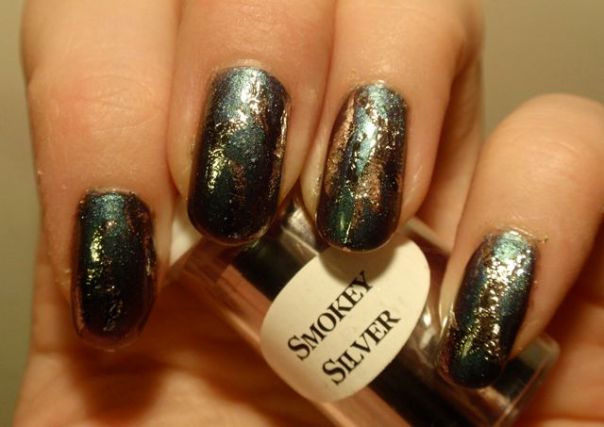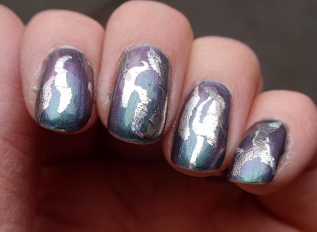 Som sagt, lite nagelfolie blev det också. Två olika nyanser av silver, dels Silver och dels Smokey Silver, köpta på eBay från No 1 Nail Art Shop. Jag ritade lite oregelbundna streck med folielimmet och applicerade det silvriga, målade igen och applicerade det rökigt silvriga. Det blev helt ok, även om skillnaden i färg på folien inte syntes så väl.