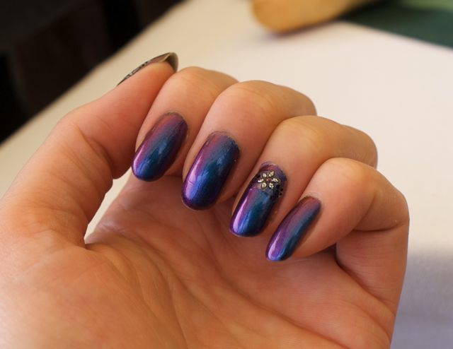 Hitslacken är lite av en favorit för mig på resor eftersom de är så små så två av dem fick följa med till Tjeckien, men jag har börjat inse att de har sina nackdelar. Jag gillar verkligen inte deras formula. Till att börja med är de tjocka och kletiga att lacka med. De skulle seriöst behöva förtunnas, men jag hade ju förstås inte med mig någon förtunning. Dessutom är penseln tjock och spretig att måla med, så det blev rätt kletigt. Till råga på allt så torkade det extremt långsamt. Ärligt talat blev det aldrig helt torrt, så det blev hack i det och det såg inte så kul ut. (Som tur är blev det mest hack i högerhandens lack, så det syns inte så mycket på bilderna.) Färgen är fin, däremot. Det är duokromt och skiftar tydligt mellan blått och lila.