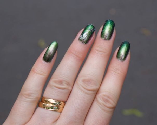 Så formulan på det här lacket är verkligen ingen höjdare, men färgen kompenserar genom att vara otroligt tjusig! Inomhus i lampljus ser det knalligt äppelgrönt ut och skiftar till lila via blått. Utomhus får det en kallare grön färg och i sol blir det nästan gammelrosa och lite guldigt. Det är verkligen fascinerande att titta på! Därför blir det också lite bildspam, jag kunde helt enkelt inte välja färre bilder om jag ville visa alla dess olika nyanser.