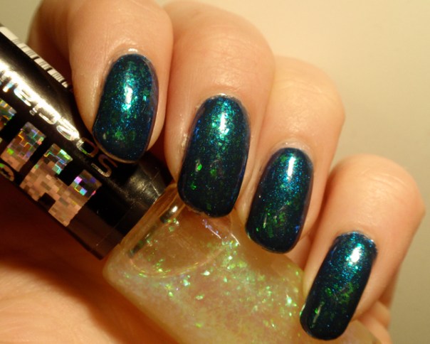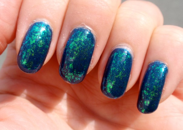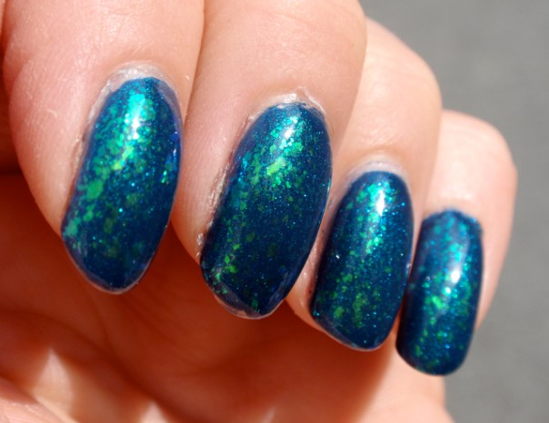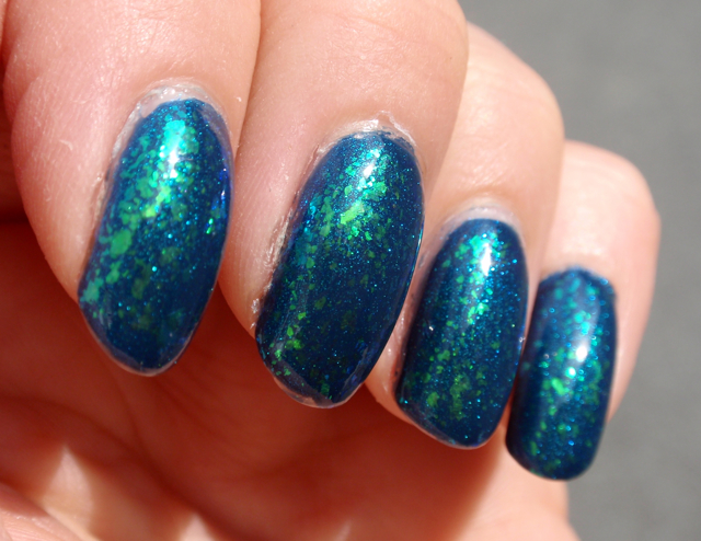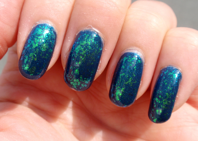 Nu blev det nästan ett nail art sundayinlägg för andra veckan i rad. Jag har för mig att reglerna var att det skulle vara minst två olika lack involverade, och det här är ju tre. Det blev ett lager till på min manikyr med Nubar Dark Wash Jeans och Sminkans Moon of Endor. Jag fick syn på det här flakelacket bland mina otestade lack och tyckte det skulle passa bra ovanpå, vilket det också gjorde. Flakglittret är duokromt i blått och grönt, och det blev riktigt fint med en blå bas. Jag fick många komplimanger för det här. Det här är ett lager Jazz och det började bli ganska tjockt med alla lager under. Jag hade lite tipwear också, men ni får väl försöka bortse från det… För övrigt var skiftningarna tydligare än det ser ut på mina bilder, men min kamera ville inte riktigt fånga dem.