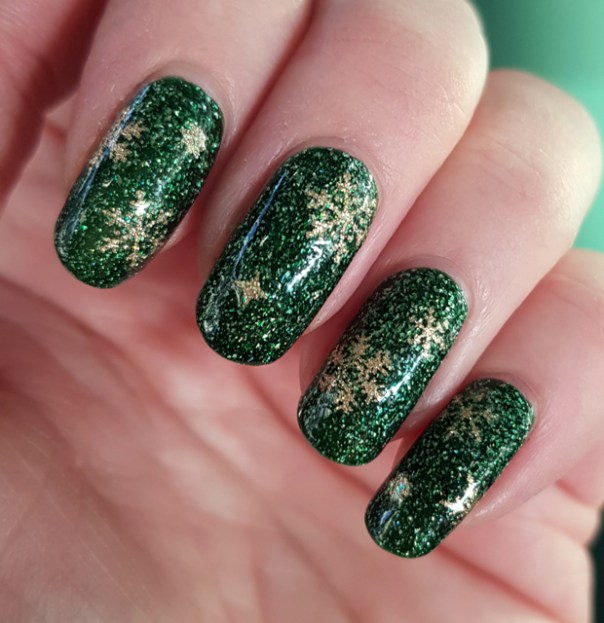 Eftersom julen närmar sig så blev det en julig dekor bestående av guldsnöflingedekaler från Nailtopia. De var väldigt tunna och fina, men tyvärr lite för detaljerade för att de skulle synas ovanpå det något röriga glitterlacket.