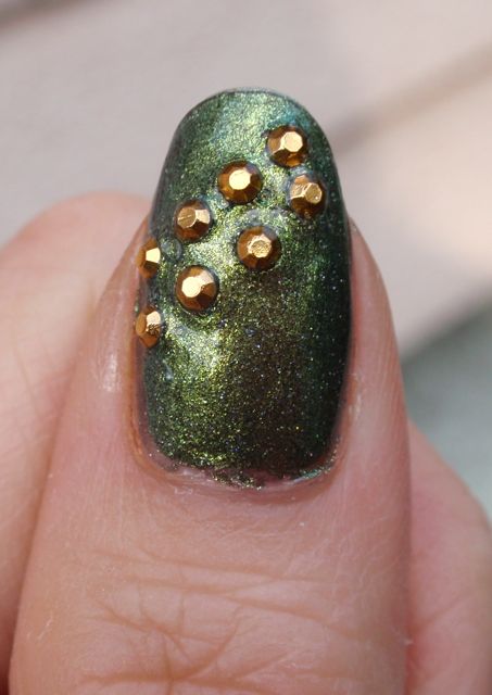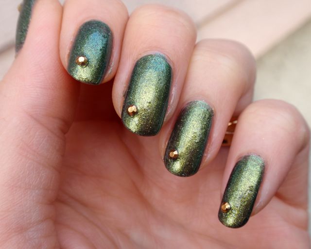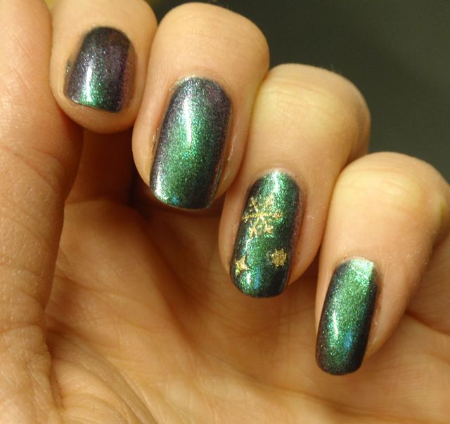 Inte heller det här lacket skrev jag något om, och kommer följaktligen inte ihåg så mycket om det heller. Jag är rätt säker på att jag hade tre lager av det. Det är ett fint multikromatiskt lack som skiftar mellan guld, grönt och blått, och det har också lite diskret holoskimmer i sig.