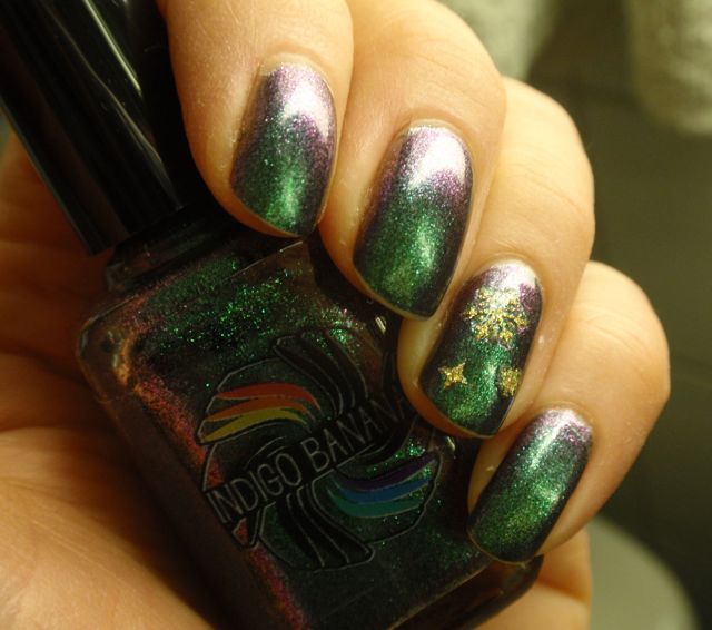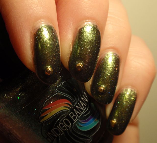 Holofredag är en temadag som jag saknar lite, så jag kör ett holo idag även om holofredagen egentligen är nerlagd. Indigo Bananas Quantum Gravity (HOLO) är ett riktigt fint multikromatiskt holoflakie som jag har för mig att jag bar i somras när jag skulle testa om jag kunde använda lack fast jag hade nagellossning. (Vissa funkade det för.) Det kunde jag inte. Nagellossningen blev värre, så jag gick naken ett par månader till efteråt, men det är hur som helst ett riktigt fint lack! Det är som sagt multikromatiskt och skiftar mellan guld och grönt, fast det har också ett stänk av koppar i sig. På det så har det också en inte oansenlig holoeffekt. Jättetjusigt! Jag bar två lager av det över ett vanligt guldlack (Jade Ouro Liquido) för att spara lite på härligheten och slippa ha flera lager för att få det täckande.