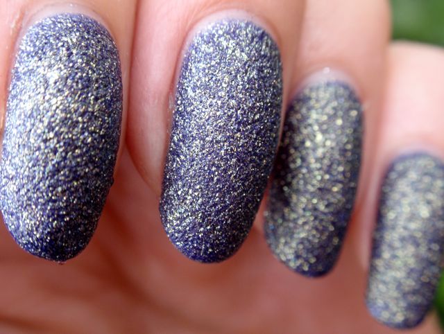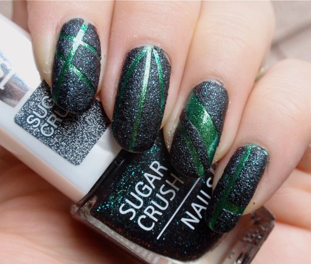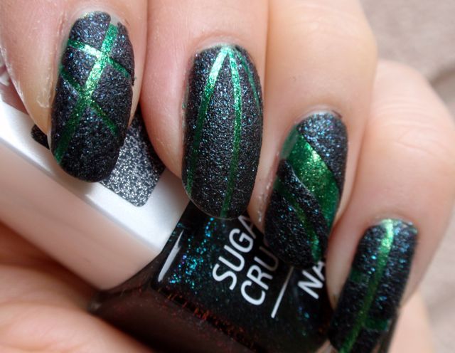 Jag har börjat svänga lite vad gäller strukturlack. Från början var jag inte särskilt förtjust i dem och gillade inte den sträva känslan, men nu har jag vant mig vid strävheten och det har börjat komma en del riktigt läckra färger. Emerald Crush från Isadoras Sugar Crushkollektion är väldigt mörkt grönt med blågrönt skimmer. Riktigt fint! Jag valde att göra en tejpmanikyr av det med underbara Zoya Ivanka i botten. (Varje gång jag använder det lacket förundras jag över hur otroligt vackert det är!) Ivanka är dock relativt skirt, så det krävdes tre lager av det och sedan två lager Emerald Crush för att få det täckande. Jag gillar hur det blev. Kontrasten mellan det skrovliga, matta glittret i Emerald Crush och det släta glansiga i Ivanka blev rätt intressant, och dessutom blev det en tredimensionell effekt eftersom jag inte jämnade ut allithopa med överlack.