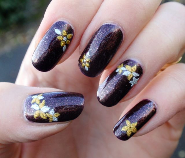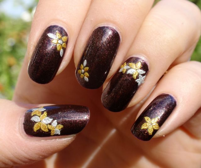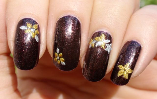 Här har vi en riktigt gammal manikyr (fyra år, faktiskt) som jag har grävt fram ur arkivet. Isadora Autumn Leaves går ändå fortfarande att köpa (jag hittade det på Lyko t ex vid en snabb googling). Det är ett riktigt fint, brunrött skimmerlack. Det täckte på två lager och hade en utmärkt formula. Dekalerna är från eBay.