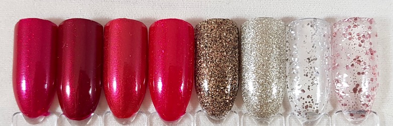In English: The Depend Christmas collection Holiday Cheer consists of four red shimmer polishes and four glitters. Nothing that is exactly surprising in a Christmas collection, but pretty nice colours. Two of the glitters are opaque and two are toppers, one silver and one pink. The collection was sent to me as press samples.
