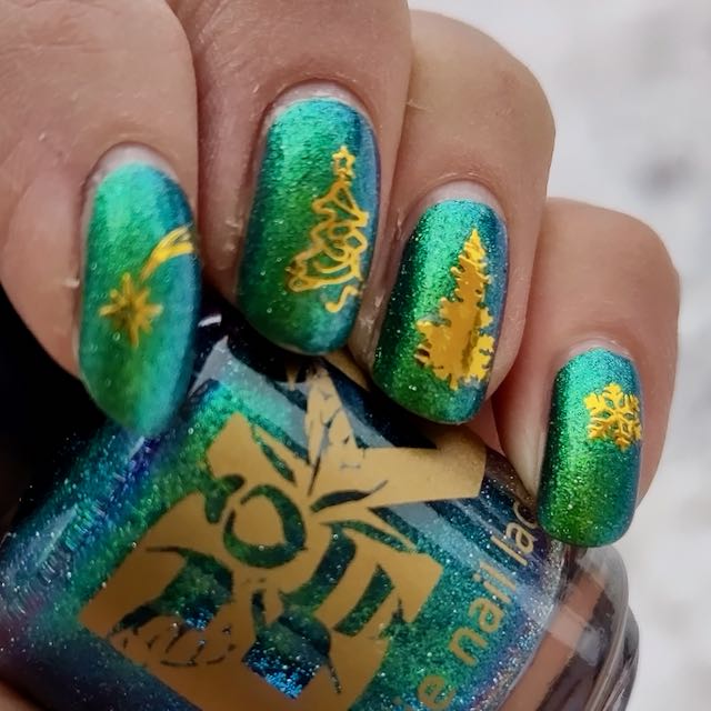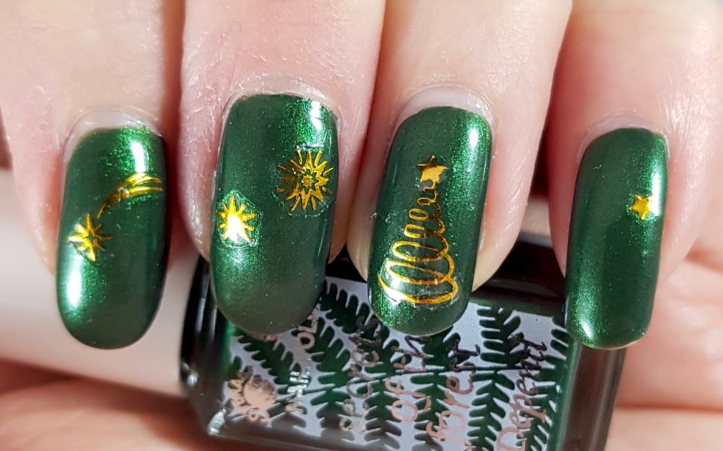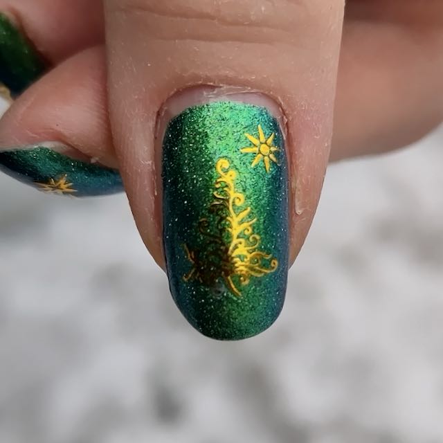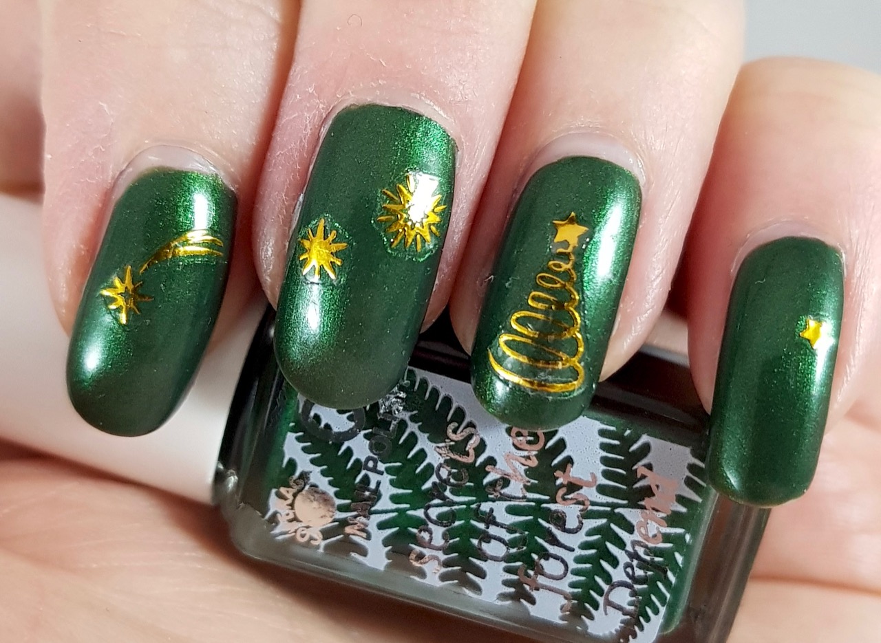 This is a very simple manicure. The base is Depend O2 To the Treetops!, a press sample from the Secrets of the Forest collection, Christmas 2021. I think I wore three coats, but I am not sure. It is a gorgeous emerald green shimmer in my absolute favourite colour. So pretty!