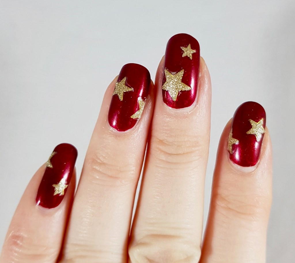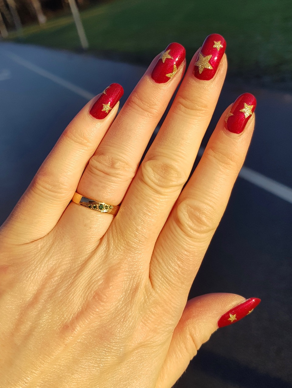 Basen är ett fint rött skimmerlack, Jingle All the Way, som jag har fått som pressprov från Holiday Cheer, julkollektionen 2020. Jag kommer inte ihåg om jag hade två eller tre lager, men det var bra att applicera i alla fall. Sedan applicerade jag en bunt stjärndekaler i guld och var nöjd. (Observera att mitt brutna lillfinger faktiskt börjar se nästan normalt ut! Det är fortfarande lite snett när jag böjer det, men jag har hopp om att kunna träna upp det lite mer så det blir lite rakare.)