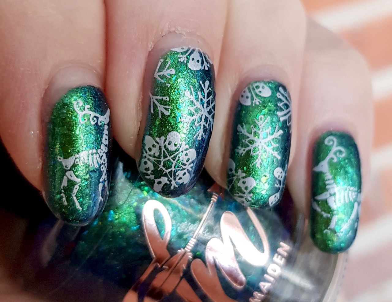 Min ursprungsplan för dekoren var en dubbelstämpling som bara blev kladdig och ful, så jag ledsnade, tog bort den och valde en platta (Hit the Bottle Bah Humbug 02) med något mindre gulliga julmotiv – renskelett och snöflingor med små skallar. Stämplingslacket är också från Hit the Bottle och är ett vitt skimmer, Moonshine, som täckte riktigt bra och var lätt att stämpla med. Jag var väldigt förtjust i den här lite mer Halloweeniga versionen av julnaglar!