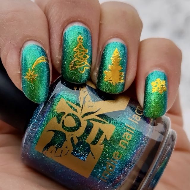 I stamped it two days later up in the cabin, since I didn’t have time before we left. I used the MoYou London Festive 18 plate and a gold stamping polish from Born Pretty Store. This time they both collaborated and the stamping went quite well.