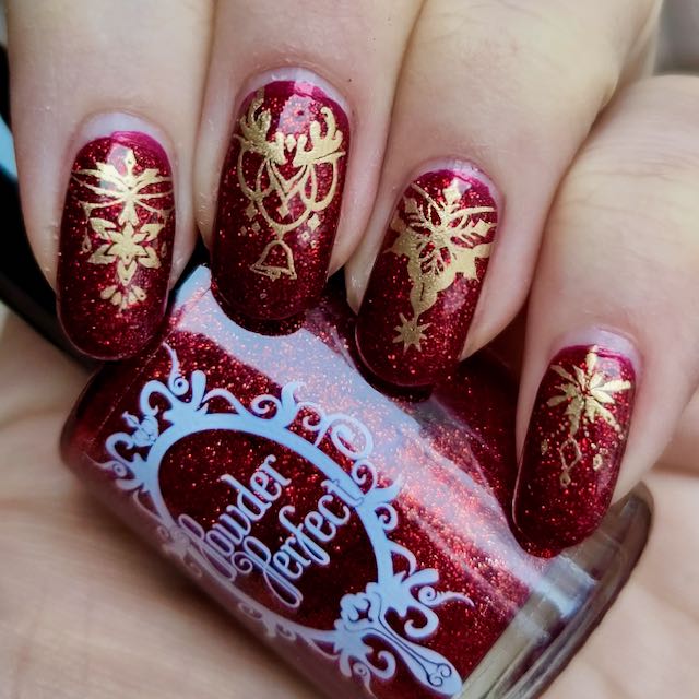 Årets julmanikyr blev en ganska traditionellt rödglittrig affär med stämpling i guld. Eftersom det brukar vara ett härke att få glitterlack att täcka så grundade jag med två lager OPI Sending You Holiday Hugs, ett gammalt pressprov från Love OPI, XOXO, julkollektionen från 2017. Det är ett sånt där härligt rött skimmerlack som OPI gör så bra, och även om det är sex år gammalt vid det här laget så gick det fortfarande alldeles utmärkt att lacka med det. Guldskimret som jag såg i flaskan när det var nytt är däremot i stort sett borta vid det här laget. På det hade jag ett lager Powder Perfect Kevin!, ett underbart julrött glitterlack. Det är superfint, väldigt glittrigt och helt perfekt till jul!
