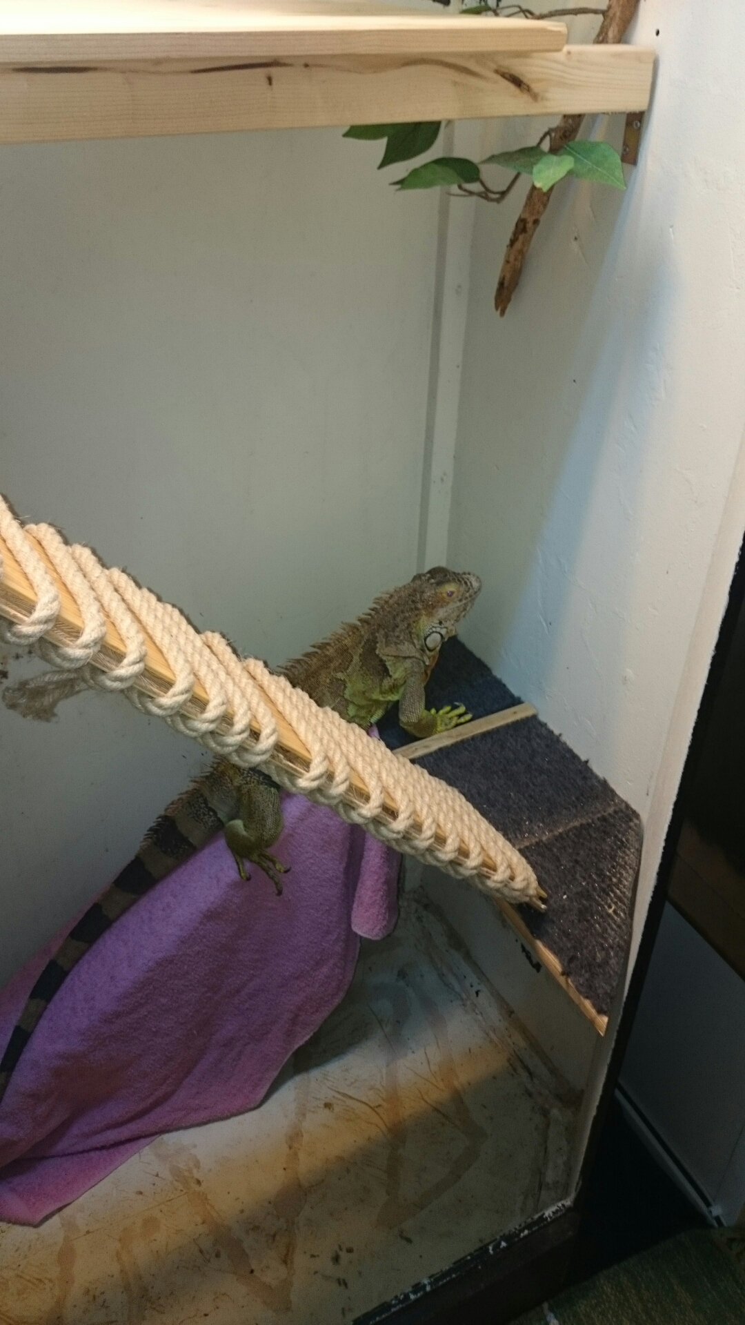 Vi har länge tänkt fixa till inredningen i Katlas terrarium. Hennes hylla har varit lite för liten och när hon har blivit äldre har hon fått lite svårt att ta sig upp och ner eftersom hon har haft dåligt fäste på rampen, som dessutom har varit för brant. Igår, när jag låg däckad i en förkylning, fick maken ett ryck och fixade det (så när som på den nedre rampen, repet räckte inte till den).