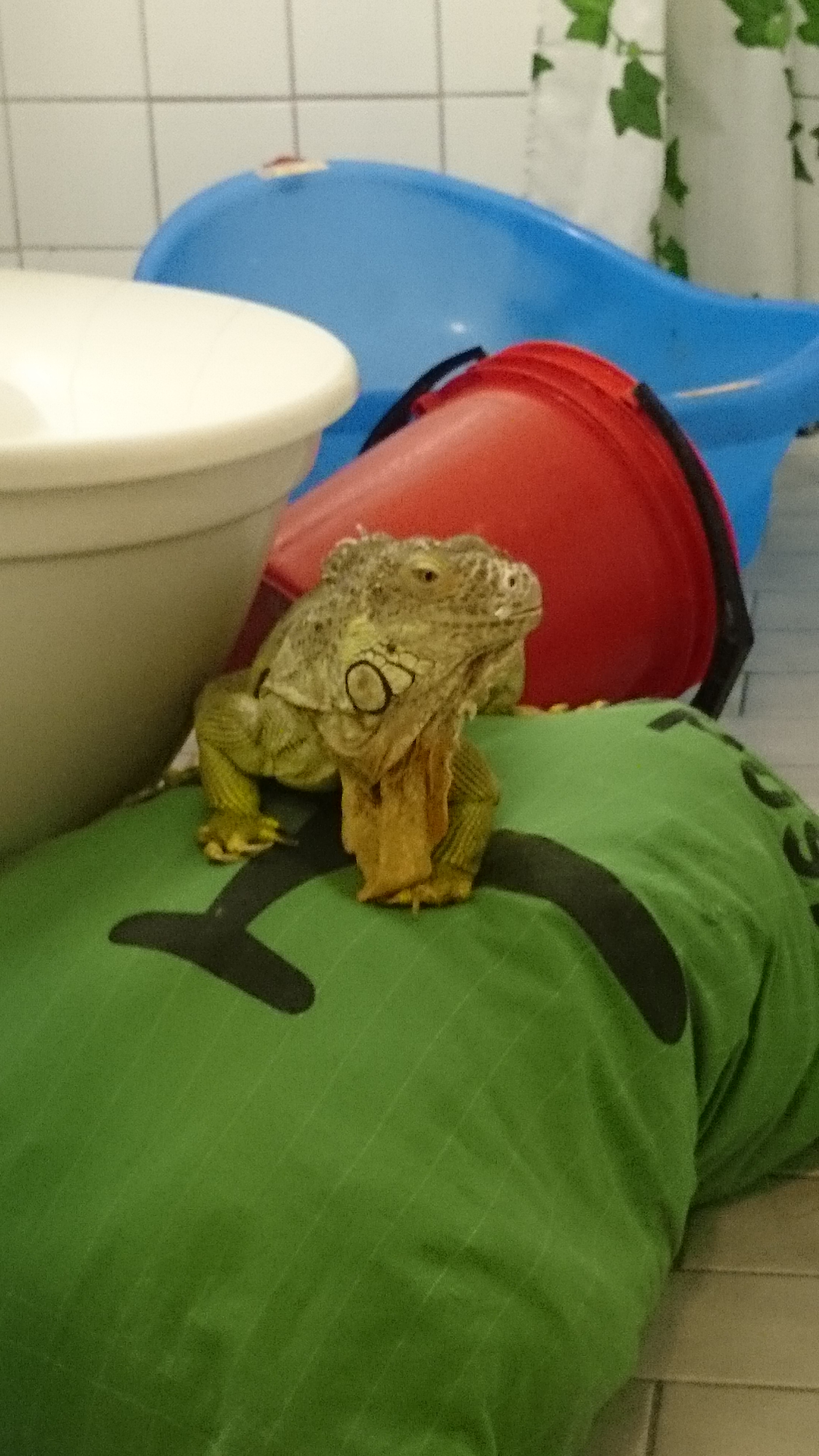 In English: My iguana Katla has not been very well lately. She always gets tired and eats poorly during the winters (Iguanas are not meant to live here – they should be in the rain forest). We have a UV lamp, a heat lamp and a humidifyer for her, but she still gets tired. I think she might also pick up my winter downs, since she tends to mirror my mood. This year has been worse than usual, but the winter has been harsh and she is very old, so we thought that might be the cause. (She is 16,5 years old, which is a lot for an iguana.) However, she did start eating again a couple of weeks back, but was very tired anyways, so we took her to the vet for a checkup. She has lost a lot of weight, but she lost it so slowly that I didn’t notice until about a week ago, and once I saw it, I was shocked.