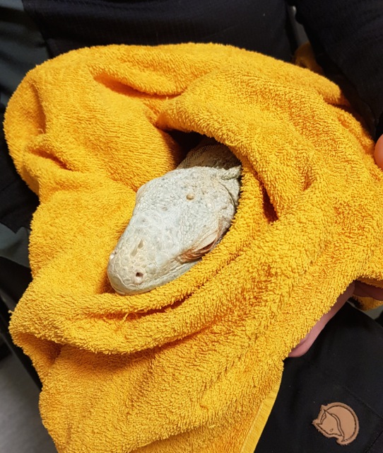 Hon har som sagt ätit väldigt lite och har blivit tunn, men det var först för någon vecka sedan som jag insåg precis hur tunn hon har blivit. Det har gått så långsamt att jag inte märkt det. Som tur är har hon börjat äta lite bättre de senaste veckorna, men hon var så trött att vi ändå var oroliga, så vi åkte till veterinären med henne i förrgår. Vår veterinär är suveräna Marianne Tornvall på Mälarens smådjursklinik. Hon är otroligt bra – mycket kunnig, trevlig och bäst på alla vis! Om ni har reptiler eller fåglar och letar efter en veterinär så kan jag varmt rekommendera henne. Det är ju viktigt att hitta en specialist när man har ett ovanligt djurslag. Veterinärutbildningen kan ju inte hinna täcka alla djurslag som finns, så det ingår inte särskilt mycket om reptiler. Marianne har gått specialistkurser i USA för att vidareutbilda sig. Hon blev f ö utsedd till Årets Veterinär 2014, så det är inte bara vi som tycker att hon är bra!