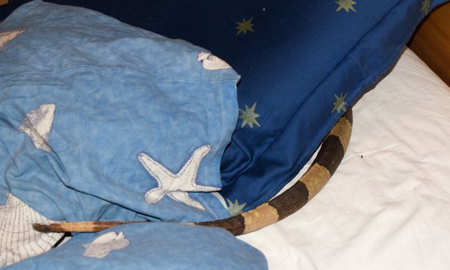 När jag tog upp henne ur sängen på kvällen för att lägga tillbaka henne i terrariet var hon väldigt sömnig och gosig och somnade på min mage under en filt istället. Och vid nästa försök att lägga henne i terrariet (när jag skulle gå och lägga mig) var hon inte alls med på noterna och klättrade upp på mitt huvud istället för att lägga sig på sin hylla. Så jag veknade och lät henne sova i sängen med mig. Hon ligger oftast raklång längs med mitt ben under täcket, ibland med huvudet på min ankel, och är ganska sval och trevlig att ha i sängen. Hon är ju växelvarm så hon uppskattar min värme och jag uppskattar att hon stjäl lite av den så jag inte blir för varm (särskilt nu på sommaren).