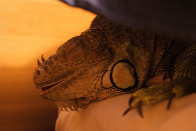 If anyone wants to learn more about iguanas there are a lot of good sites and books, but I recommend Melissa Kaplans Green Iguana Care Collection. Iguanas are not easy pets, they are quite sensitive and can get very ill and die if they are not properly fed and are kept in the right environment. They also need to be socialized from a young age or they can get very aggressive and potentially dangerous. We were lucky to get Katla when she was an adult. Her previous owners had done a very good job socializing her and she is an exceptionally nice and even cuddly little dragon. She even sleeps with us sometimes, laying along my legs under the covers.