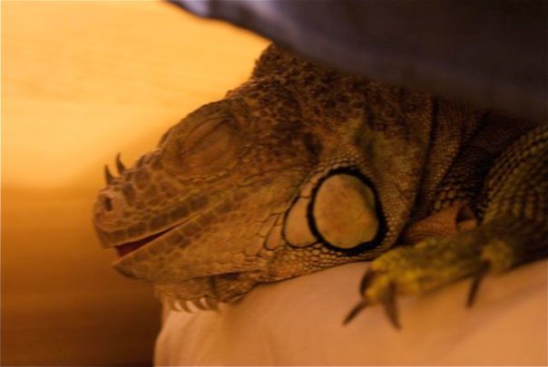 Efter alla äventyr var det en ganska trött leguan som vi bar hem. Hon gosade en del med husse och sedan somnade hon hos mig igen. Så söt… 🙂