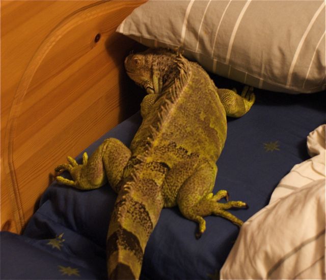 I haven’t written about my darling green iguana in a while. Actually, she is part of the name of the blog (”nageldraken” means ”nail dragon” in Swedish), but lately she has spent most of her time sleeping in our bed, so there has not been that much to write about. She usually prefers to sleep squashed underneath our heavy pillows with only the tail sticking out, but yesterday she slept under our down covers with only the nose outside. She is getting a little old (10 years), so I guess she needs a lot of rest. Or maybe she’s just lazy and likes our bed… 🙂